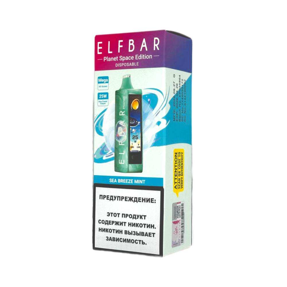 - Купить электронную сигарету ELFBAR 25000 PLANET Мятный морской бриз в магазине snusmsk — отличный выбор для ценителей свежих и прохладных вкусов. Эта модель рассчитана на 25000 затяжек, что обеспечивает длительное и комфортное использование без необходимости заправки или подзарядки. ELFBAR 25000 PLANET отличается компактным и стильным дизайном, который удобно носить с собой в любых условиях. Вкус Мятный морской бриз сочетает бодрящую свежесть мяты и холодные ноты морского воздуха, создавая приятное охлаждающее ощущение при каждом вдохе. Такое сочетание дарит мягкий и насыщенный пар, который подойдет как новичкам, так и опытным пользователям электронных сигарет. Устройство оснащено мощной встроенной батареей и оптимальной подачей никотина, что обеспечивает стабильную работу и качественный пар на протяжении всего срока эксплуатации. Магазин snusmsk предлагает только оригинальные электронные сигареты ELFBAR с гарантией качества, быстрой доставкой по Москве и России, а также выгодными предложениями для покупателей. Здесь вы сможете легко оформить заказ и получить устройство в кратчайшие сроки. ELFBAR 25000 PLANET Мятный морской бриз — идеальный выбор для тех, кто хочет насладиться свежестью и прохладой в удобном и надежном формате. Покупая ELFBAR 25000 PLANET Мятный морской бриз в snusmsk, вы получаете высококачественный продукт с насыщенным вкусом, который всегда будет рядом для комфортного парения.